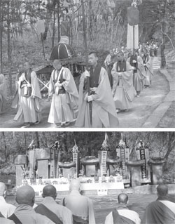 ¹ý¹®ÀÌ ³¡³ª°í ¿µ°¡µéÀ» ¸ð½Ã´Â ´ë·É°ú °ü¿åÀÌ °ÅÇàµÈ´Ù. Áغñ¸¦ À§ÇØ ¹Ù»ß ¿òÁ÷ÀÌ´Â °¿ø½º´Ôµé°ú ³ëÀü½º´Ô, ºÎÀü½º´ÔµéÀÌ º¸ÀδÙ. ¸ñʰú ¿ä·É, Å¡°ú ¼ÒºÏÀÌ ÀÏÁ¦È÷ ³»·ÁÁö°í ÀǽÄÀÌ ½ÃÀ۵ȴÙ. ´ë·É ¶§ ¾µ ¿µ°¡µéÀ» À§ÇÑ ±¹¼öµµ º¸À̰í ÇÑÂÊ¿¡´Â º´Ç³¿¡ ÇâÅÁ¼ö¿Í ¿µ°¡µéÀÇ ¿Ê°¡Áö°¡ º¸ÀδÙ. Àç´ë·É°ú °ü¿åÀÌ ³¡³ª°í ¿µ°¡µéÀÇ ÃµµµÀǽÄÀÌ ½ÃÀ۵ȴÙ. °üÀ½½Ã½Ä¿¡ ÀÇÇØ ¿µ°¡µéÀÌ ºÎó´ÔÀÇ ¹ýÀ½À» ³ªÄ§¹Ý »ï¾Æ¼ ±Ø¶ô¼¼°è·Î ¿©Á¤À» ÁغñÇÏ°Ô Çϱâ À§ÇØ ³ëÀü ºÎÀü½º´ÔÀÇ ¸ñûÀÌ µå³ô¾Æ Áø´Ù. ¶ÇÇÑ ¹ý´ç»ç¹°ÀÇ ¿îÀ²¿¡ ¸ÂÃß¾î ÈûÀÌ ½ÃÀÛµÇ¸é ½Ã½Ä¿¡ Âü°¡ÇÑ ºÒÀÚ´ÔÀÇ ´«¹°Áþ´Â ¼Ò¸®°¡ ¿©±âÀú±â¿¡¼ µé¸°´Ù. ÀÌ ¸ðµç ÀǽÄÀÌ ´Ù ³¡³ª°í ¿µ°¡µéÀ» ¹Ý¾ß¿ë¼±¿¡ ¸ð½Ã°í ½º´ÔµéÀÇ ¾ÕÀå¿¡ ´ëÁßµéÀÌ µû¶ó¼ ÁغñµÈ ¼Ò´ë·Î ¿òÁ÷ÀδÙ. ¹Ý¾ß¿ë¼±¿¡ Å¿öÁø ¿µ°¡µé°ú ´Ù¶ó´ÏµéÀ» Å¿ì¸ç ¿µ°¡ õµµ¿Í Âü°¡ÇÑ ºÒÀÚ´ÔµéÀÇ ¾÷Àå¼Ò¸êÀÌ ÀÌ·ç¾îÁø´Ù.